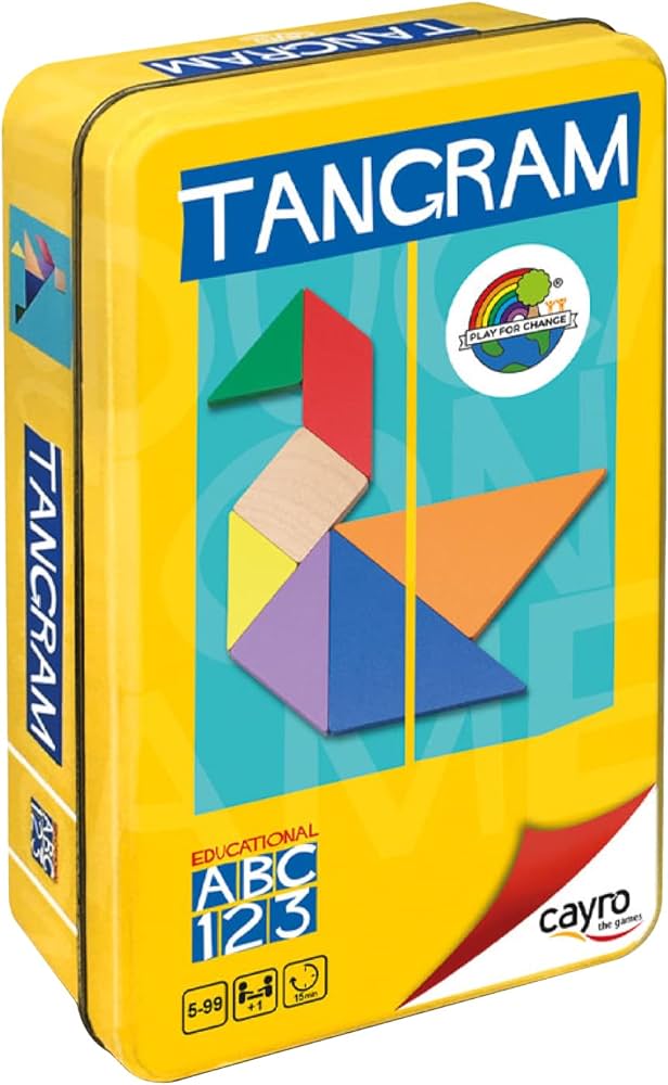 angram de madera presentado en caja de metal. El Tangram es un juego de origen chino.