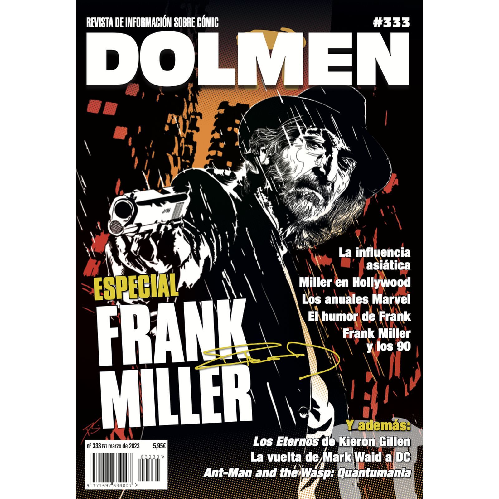 En este tercer mes del 2023 convertimos la revista Dolmen en un nuevo monográfico, centrado en esta ocasión en la figura de Frank Miller. En estas páginas analizaremos la vida y obra del autor de Born Again, Sin City, Ronin o Batman: Año Uno, abordando su currículum desde nuevos puntos de vista con artículos que incluyen un análisis del particular humor de Miller, su etapa hollywoodiense, aquellos maravillosos anuales arácnidos de los ochenta, las influencias asiáticas en sus lecturas que condicionaron tantas de sus obras o un vistazo a su producción durante los años 90, a menudo injustamente olvidada. Además, este especial también incluirá sendos artículos de actualidad de Marvel y DC, con un análisis de Eternos de Kieron Gillen y otro sobre lo que ha supuesto el regreso de Mark Waid a DC Comics tras muchos años lejos de la editorial. Además, este número 333 contendrá un análisis de Ant-Man & The Wasp: Quantumania y las columnas habituales que nos acompañan todos los meses.