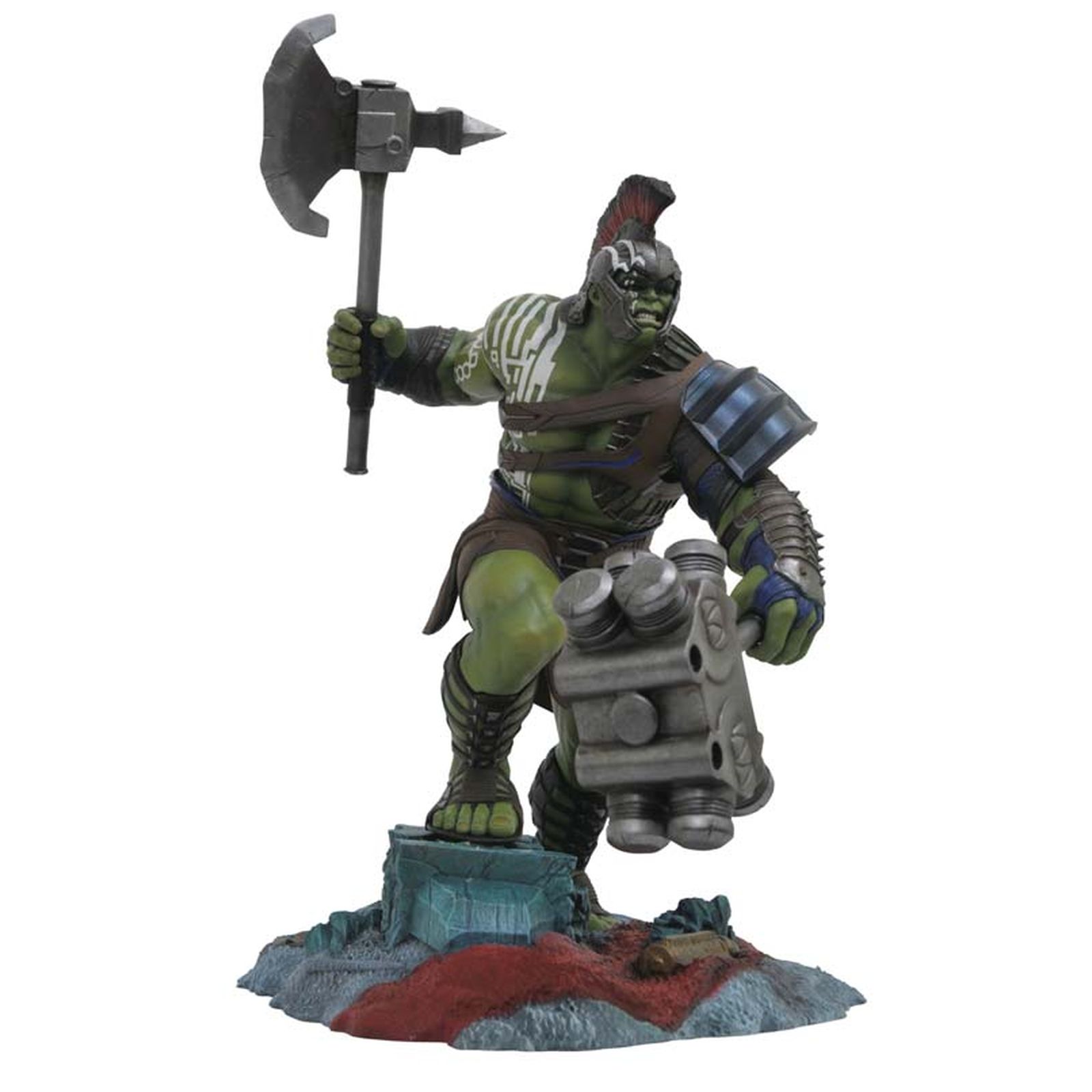 Diamond Select Toys vuelve a presentar, dentro de la colección Marvel Gallery, la figura de Hulk tal y como aparece en la película «Thor Ragnarok», en su punto más enfurecido, vestido como gladiador y blandiendo sus dos armas. Se trata de una figura de PVC, esculpida por Rocco Tartamella, que ofrece un alto nivel de detalle y que mide unos 30,5 cm de alto.
